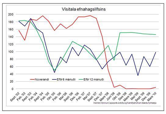 Álíka margir telja að aðstæður þróist til betri vegar á næstu sex mánuðum og að þær versni. Samanborið við fyrri kannanir lýsir þessi niðurstaða töluvert meiri bjartsýni um bata á næstunni en ríkt hefur síðast liðið ár. Raunar er gildið á vísitölu efnahagslífsins eftir sex mánuði hærra nú en það hefur verið að meðaltali frá árinu 2005 og mun hærra en það var árin 2005 og 2007. Bjartsýnin er síðan mest um að ástandið verði betra eftir 12 mánuði, en allt frá hruninu hafa þessar kannanir sýnt væntingar um að ástandið verði orðið betra eftir eitt ár, en þær hafa því miður ekki gengið eftir. Sem dæmi um þetta má nefna að í mars 2009 töldu 59% svarenda að aðstæður yrðu betri eftir 12 mánuði en þegar þeir voru spurðir ári síðar þá töldu aðeins 2% þeirra að aðstæður væru góðar.