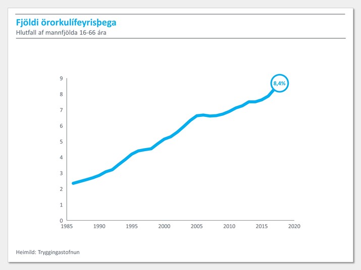 Áskoranir á vinnumarkaði eru því miklar og enn eykst hlutdeild þeirra sem falla út af vinnumarkaði vegna örorku af mannfjölda á vinnualdri, 16-66 ára.