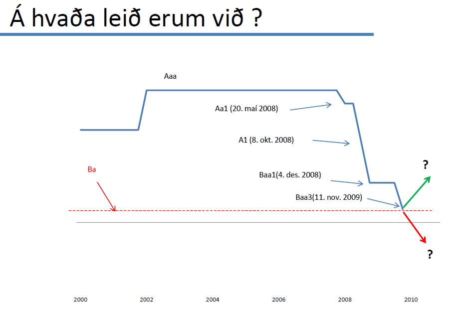 Björn Rúnar sagði að við hrun bankanna hafi efnahagleg staða ríkissjóðs breyst úr því að vera óvenju hagstæð yfir í að vera mjög óhagstæð. Viðvarandi hallarekstur skapi hættu á ríkið komist í þrot og því þurfi að bregðast skjótt við. Björn Rúnar spurði á hvaða leið þjóðin væri og birti meðfylgjandi mynd af þróun lánshæfismats ríkissjóðs: