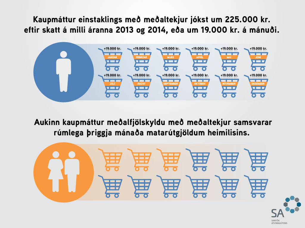Ávinningur heimilanna af þróun undanfarinna mánaða er mikill. Kaupmáttur einstaklings með meðaltekjur jókst t.d. um 225 þúsund krónur eftir skatt á árinu 2013 eða um 19 þúsund krónur á mánuði. Kaupmáttur hjóna með meðaltekjur jókst um 450 þúsund krónur sem samsvarar rúmlega þriggja mánaða matarútgjöldum meðalheimilis.
