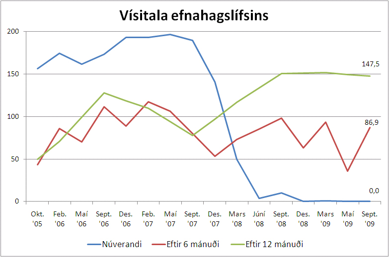 Samkvæmt þessu eru aðstæður í efnahagslífinu nú taldar afleitar líkt og í könnunum undanfarið ár. Lægsta gildi vísitölunnar er 0, þegar allir telja aðstæður verri en hæst 200, þegar allir telja þær betri. Jafnvægi er við gildið 100, þegar jafn margir telja aðstæður betri og þeir sem telja þær verri.