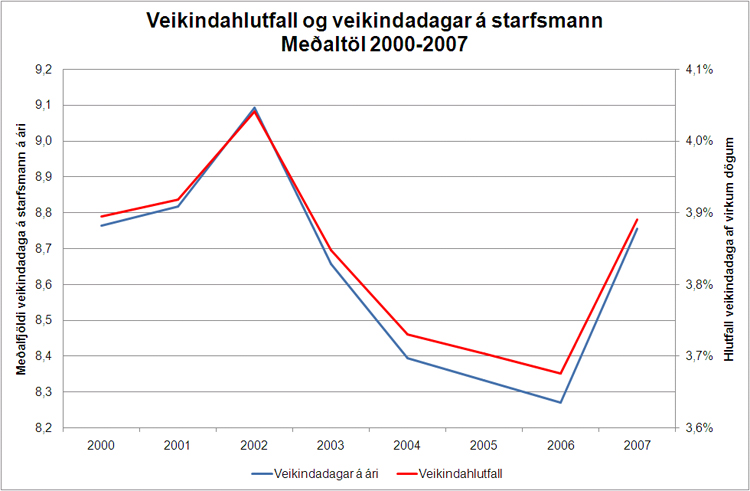 Á meðfylgjandi mynd má sjá veikindahlutfall og veikindadaga á starfsmanna á tímabilinu 2000-2007. Meðalfjöldi veikindadaga var 8,8 árið 2007 og veikindahlutfallið, þ.e. hlutfall veikindadaga á ári af vinnudögum ársins, var 3,9%. Þetta er nokkur aukning frá 2006 þegar veikindadagar voru 8,3 að meðaltali og veikindahlutfallið 3,7%. Veikindadagarnir voru þó færri en á árunum 2000-2003.