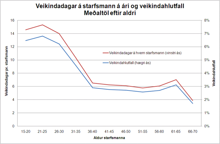 Veikindafjarvistir eru áberandi mestar í yngstu aldurshópunum. Veikindadagar eru að meðaltali 14-15 á ári í aldurshópnum 15-30 árs, sem nemur 6-7% vinnudaga. Í aldurshópnum 31-35 ára fækkar veikindadögum niður í 10 að meðaltali á ári og 4,6% veikindahlutfall. Hver fimm ára hópur á aldursbilinu 35-65 ára eru með svipaðan fjölda veikindadaga á ári eða 6-7 og í kringum 3% veikindahlutfall. Elstu starfsmennirnir, 65 ára og eldri eru minnst frá vegna veikinda.
