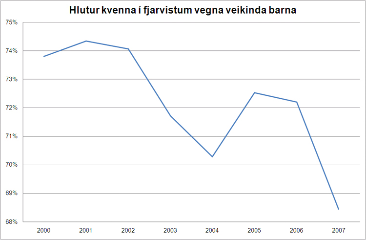 Karlar axla í auknum mæli ábyrgð vegna veikinda barna þó svo að konur axli þá ábyrgð enn sem komið er að stærstum hluta. Fjarvistir vegna veikinda barna voru 6% af fjarvistum í heild á árinu 2007 eða sem nemur hálfum degi á hvern starfsmann á ári að meðaltali. Fjarvistir vegna veikinda barna hafa minnkað jafnt og þétt frá árinu 2003 þegar þær voru 7,3% veikindafjarvista. Hlutur kvenna í fjarvistum vegna veikinda barna var 68% og lækkaði úr 72% árið 2006. Hlutfallið er allnokkuð lægra en það var í byrjun áratugarins þegar það var 74%.
