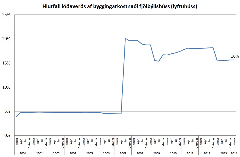 Lóðaverð nemur nú 16% af byggingarkostnaði íbúðar í fjölbýli og hefur hækkað úr 4% frá árinu 2001. Hæst varð lóðaverðið um 20% af byggingarkostnaði íbúðar í fjölbýli árin 2007 og 2008.