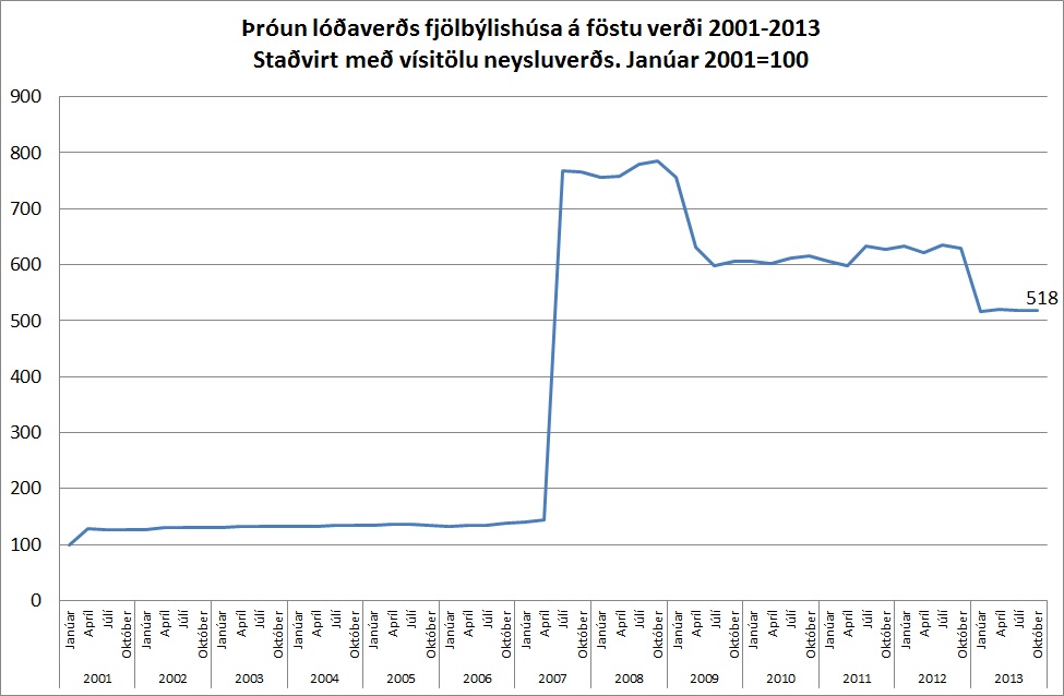 Þá hækkaði fermetraverð íbúðarhúsnæðis um nálægt 50% að raungildi í kjölfar uppboðanna. Í upphafi árs 2014 er byggingarkostnaður fjölbýlishúss 43% hærri að raungildi en fyrir rúmum áratug og má að mestu ef ekki öllu leyti rekja það til ákvarðana opinberra aðila.