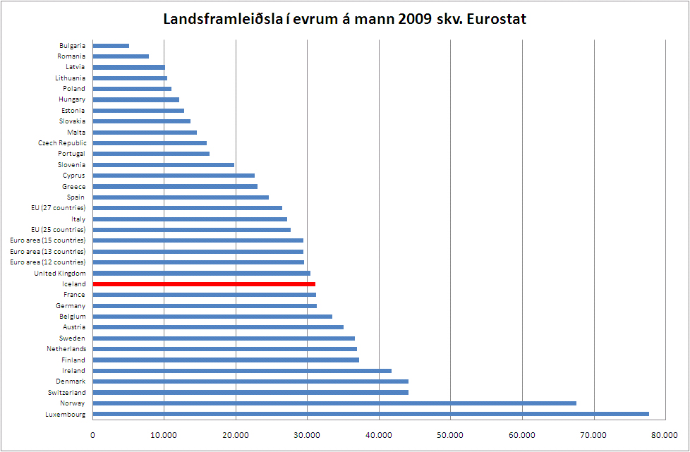 Þessi samanburður ber sterkri stöðu Íslands vitni. Þrátt fyrir fall krónunnar, harkalega aðlögun eftir ofþenslu síðustu ára og áfall vegna hruns bankanna fellur Ísland ekki neðar á þessum lista en svo að landið er enn í efstu deild þeirra þjóða sem við berum okkur saman við. Hér að neðan eru 2 súlurit sem sýna landsframleiðslu á mann í evrum árið 2009 í Evrópuríkjum. Í fyrra súluritinu eru tölur Eurostat óbreyttar og í því seinna er einungis Íslandi breytt og miðað við spá SÍ og gengi krónu gagnvart evru 141 kr.