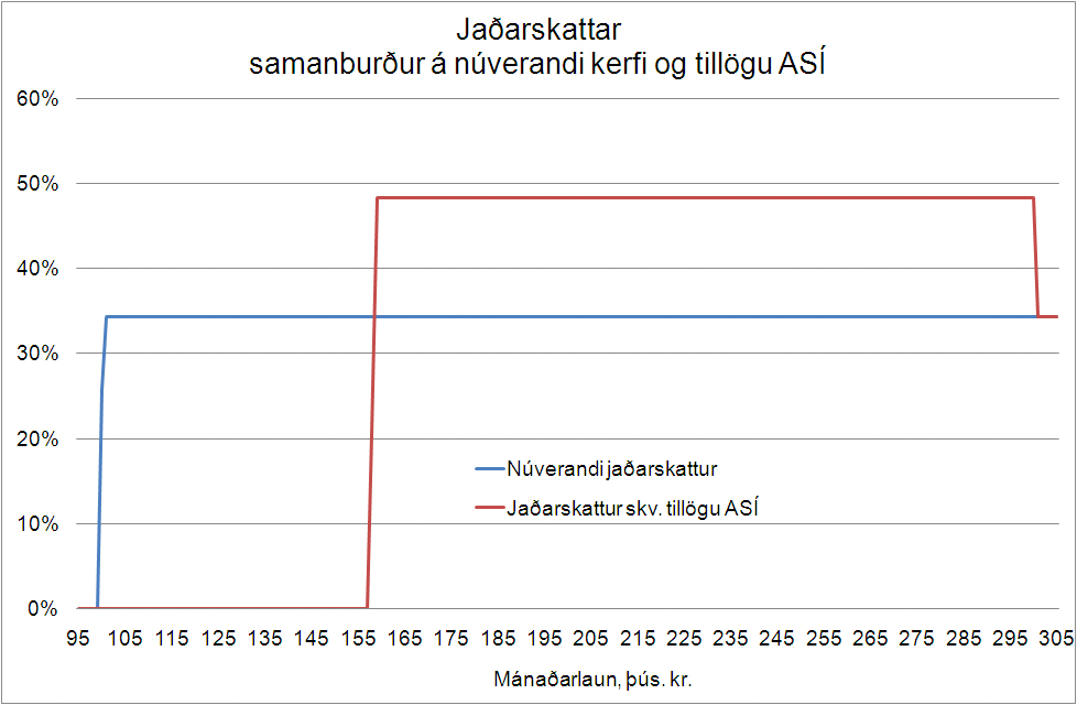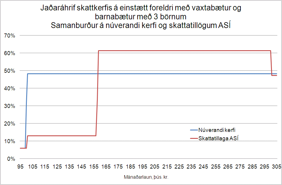 Jaðaráhrif núverandi tekjuskattkerfisins, þ.e. áhrif tekjuskattshlutfalls og skerðingarhlutfalla barna- og vaxtabóta, geta því numið 48,3% (34,3%+8%+6%) ef um er að ræða fjölskyldu með þrjú börn og vaxtabætur. Sé viðkomandi með námslánaskuldir bætast 4,75% við og jaðaráhrifin verða 54%. Tillaga ASÍ felur í sér 14% viðbót við jaðaráhrif tekjuskattsins en að auki lagði sambandið til lækkun skerðingarhlutfalls úr 8% í 7% vegna þriggja barna eða fleiri. Tillagan felur því í sér hækkun á hæstu jaðaráhrifum um 13% eða í 67% sem þýðir að einstaklingar með mánaðartekjur á bilinu 150 til 300 þús. kr. á mánuði, með barnabætur vegna þriggja barna, vaxtabætur og námslánaskuldir, myndu einungis halda eftir þriðjungi þess tekjuauka sem þeir ynnu sér inn með aukinni vinnu eða hærri launum.