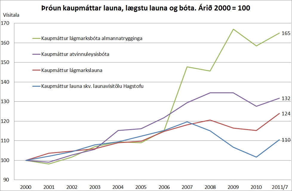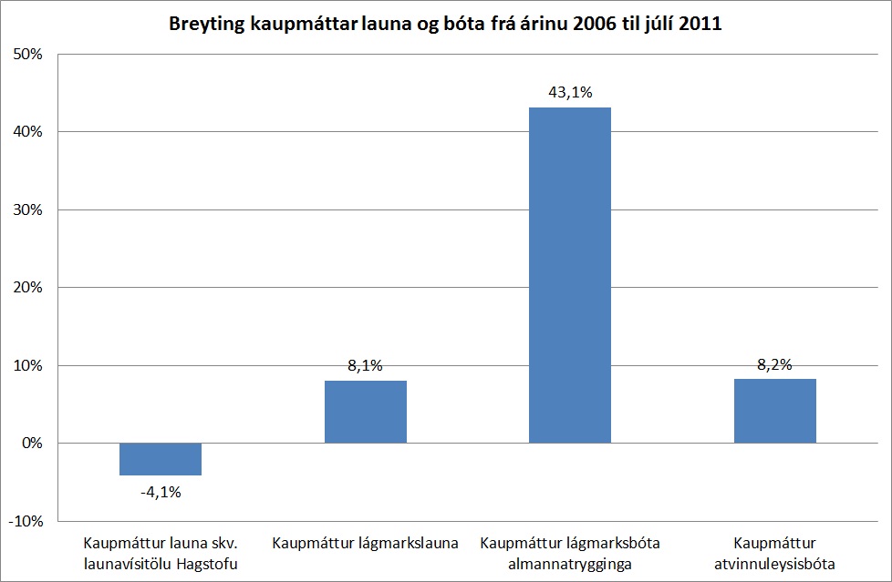 Kaupmáttur launa skv. launavísitölu Hagstofunnar var 4% lægri í júlí á þessu ári en að meðaltali árið 2006, sbr. meðfylgjandi mynd. Það er afar hagstæð niðurstaða fyrir launafólk í ljósi þess að kaupmáttur launa almennt var mjög mikill það ár og að landsframleiðsla á mann lækkaði mun meira, eða 7,5% á milli 2006 og 2010 og þjóðartekjur á mann þrefalt meira, eða 23% á þessu tímabili. Það er einnig athyglisvert að á þessu þrengingartímabili hefur kaupmáttur lægstu launa, atvinnuleysisbóta og lágmarksbóta almannatrygginga aukist verulega, og lífskjör þeirra sem búa við þau kjör batnað samsvarandi.