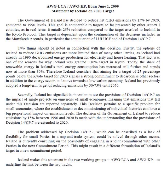 Þann 1. júní kynnti sendinefndin stefnu ríkisstjórnarinnar um 15% samdrátt útstreymis gróðurhúsalofttegunda frá 1990 til 2020 að uppfylltum ákveðnum skilyrðum. Þessi skilyrði eru þau að samkomulag náist um reglur um hvernig telja beri fram útstreymi sem tengist landnotkun (landgræðsla, skógrækt, votlendi) og að ákvörðun 14. CP/7, sem kallað hefur verið íslenska ákvæðið gildi áfram. Um þessi skilyrði og sérstöðu Íslands er fjallað í stuttu máli í tilkynningu ríkisstjórnarinnar.