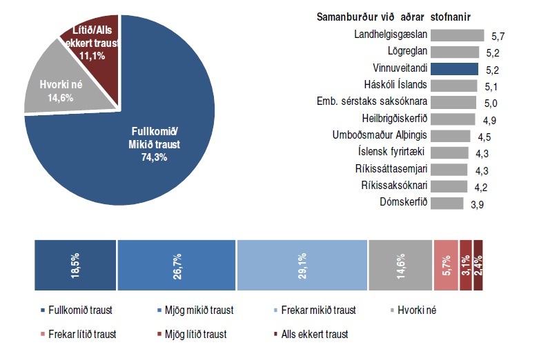 Íslendingar bera mjög mikið traust til eigin vinnuveitenda og eru jákvæðir í garð íslenskra fyrirtækja. Traust þeirra til eigin vinnuveitanda skorar einna hæst í árlegum mælingum Capacent á trausti til stofnana og embætta. Aðeins Landhelgisgæslan og lögreglan njóta meira trausts meðal fólks. Þetta kemur fram í könnun sem Capacent Gallup gerði fyrir SA. Nærri þrír af hverjum fjórum (74,3%) eru jákvæðir gagnvart sínum vinnustað og bera mikið traust til eigin vinnuveitanda. Aðeins 11,1% bera lítið traust til eigin vinnuveitanda.