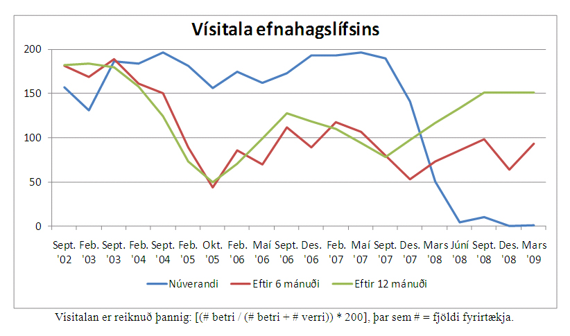 Þegar niðurstöður könnunarinnar eru þannig virtar í sögulegu samhengi blasir við að mat stjórnenda á ríkjandi aðstæðum í efnahagslífinu hefur aldrei verið jafn slæmt og fram kemur í þessari könnun og í könnun í lok síðasta árs, en vísitala efnahagslífsins sýnir lágmarksstöðu bæði í desember 2008 og mars 2009. Myndin staðfestir raunar einnig að afleitar aðstæður verða ekki eingöngu raktar til skyndilegs hruns viðskiptabankanna í byrjun október sl., heldur áttu versnandi aðstæður sér lengri aðdraganda, allt aftur til ársins 2007.