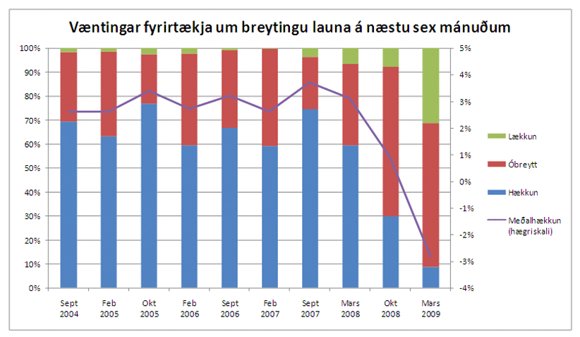 Kólnun á vinnumarkaði birtist einnig í gjörbreyttum væntingum um launaþróun. Hjá einungis um 9% þeirra fyrirtækja sem svara könnuninni er búist við að meðallaun á starfsmann muni hækka á næstu sex mánuðum, í flestum tilvikum eða um 60% er búist við að laun verði óbreytt, en hjá um 31% fyrirtækja er búist við að laun lækki. Í könnun fyrir ári síðan bjóst hins vegar um 59% fyrirtækja við því að laun myndu hækka á næstu sex mánuðum.