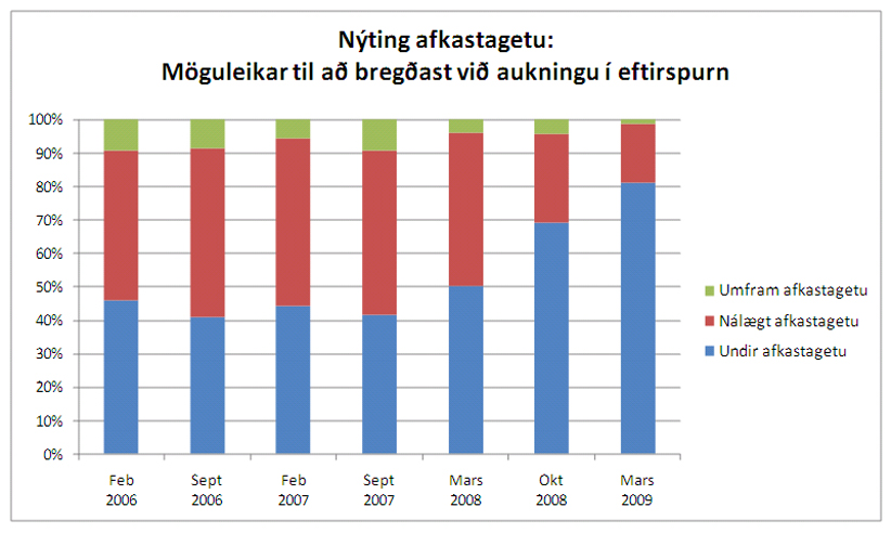 Í könnuninni er einnig spurt um möguleika fyrirtækja til að bregðast við óvæntri aukningu í eftirspurn eða sölu. Könnunin staðfestir að framleiðsluslaki mældur með þessum hætti hefur vaxið hratt allt frá því snemma á síðasta ári eins og sjá má á eftirfarandi mynd. Í könnuninni í september 2007 taldi einungis um 41% fyrirtækja að nýting afkasta væri undir hámarksgetu og að ekkert vandamál væri að bregðast við aukinni eftirspurn. Svipuð niðurstaða hafði komið fram á næstu misserum þar á undan. Þetta hlutfall hækkaði síðan í 50% í mars 2008, 69% í október og er nú 81%. Staðfestir þetta að yfirgnæfandi meirihluti atvinnufyrirtækja er nú rekin undir hámarksafkastagetu. Þá sýnir könnunin að 90% fyrirtækjanna búast við að þessar aðstæður vari næstu sex mánuði.