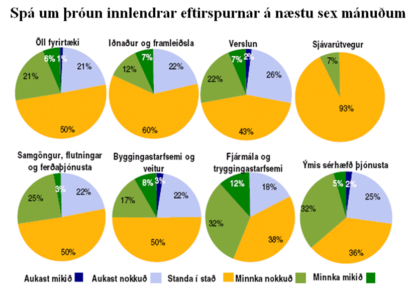 Eins og eftirfarandi mynd ber með sér er ekki mikill munur eftir atvinnugreinum á spám fyrirtækjanna um þróun innlendrar eftirspurnar í þeim atvinnugreinum sem byggjast að verulegu leyti á innlendum markaði.