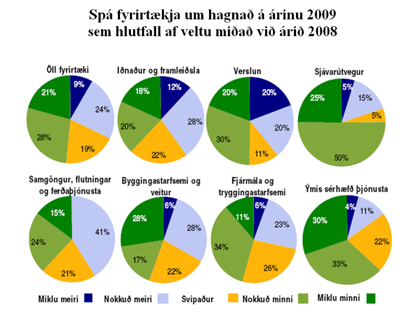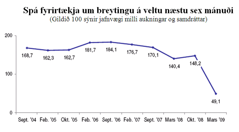 Í heild spá fyrirtækin 9,8% lækkun á veltu milli ára. Ef gengið er út frá 12% meðalhækkun verðlags milli ára felst í þessu 19,5% samdráttur að raunvirði. Til samanburðar má geta þess að samkvæmt spá fjármálaráðuneytisins frá því í janúar er gert ráð fyrir tæplega 10% magnsamdrætti í landsframleiðslu á þessu ári. Þar er gengið út frá því að 1,6% raunvöxtur verði í samneyslu milli ári. Er því ljóst að gera má ráð fyrir að samdráttur í umsvifum einkafyrirtækja milli ára verði ennþá meiri en sem nemur minnkum landsframleiðslu. Reynist spá fyrirtækjanna um samdrátt í veltu þeirra nærri lagi, er ástæða til að óttast að samdráttur í landsframleiðslu á þessu ári verði ennþá meiri en opinberar spár gera ráð fyrir.