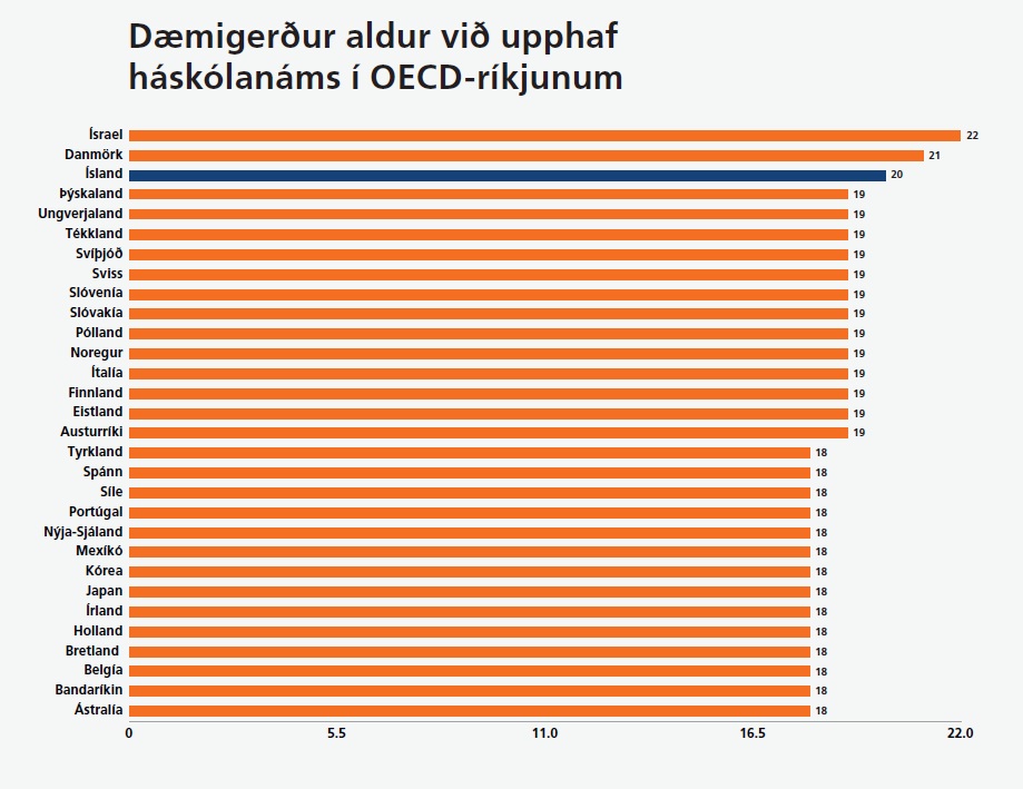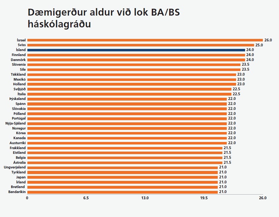 Á meðfylgjandi grafi sést að Íslendingar eru aftarlega í alþjóðlegum samanburði þegar kemur að hlutfalli íbúa á aldrinum 25-34 ára með háskólamenntun.