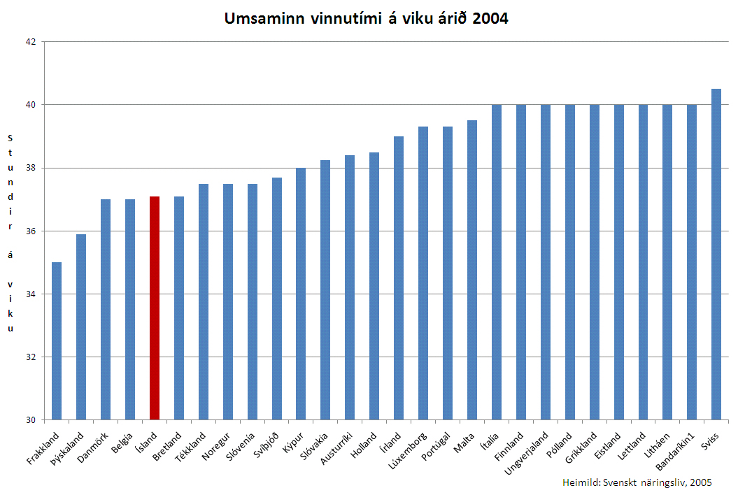 Orlof er töluvert lengra á Íslandi en í flestum öðrum ríkjum og sérstakir frídagar sömuleiðis fleiri. Samkvæmt þeim frídögum sem eru lög- og samningsbundnir hér á landi er ársvinnutíminn (á dagvinnukaupi) 1.660 stundir og hvergi lægri nema í Þýskalandi og Frakklandi, skv. yfirliti frá sænsku samtökum atvinnulífsins. Samkvæmt þessu er hvorki tilefni né aðstæður til þess að eyða miklum tíma í skoðun á því hvort stytta eigi vinnuvikuna á Íslandi.