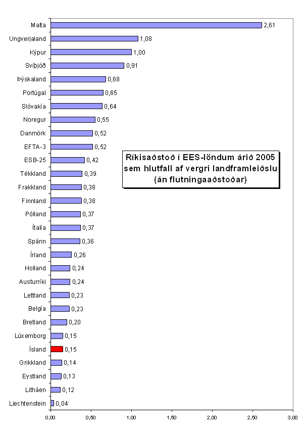Upplýsingarnar staðfesta að sem hlutfall af stærð hagkerfisins hefur ríkisaðstoð á Íslandi verið með minnsta móti samanborið við önnur ríki EES. Liechtenstein er sér á báti í þessum samanburði, en þar er ríkisaðstoð óveruleg. Ísland er í hópi með Lúxemborg, Grikklandi, Eistlandi og Litháen, en þetta eru þau lönd innan EES þar sem ríkisaðstoð er lægst, á bilinu 0,12 - 0,15% af VLF á árinu 2005. Meðaltal ríkisaðstoðar í ESB-ríkjunum var tæplega þrefalt miðað við Ísland, en meðaltal EFTA-ríkjanna 3,5 falt.