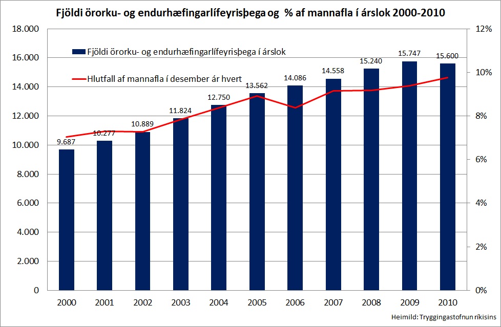 Í árslok 2010 má ætla að örorkulífeyrisþegar hafi verið um 15.600 út frá tölum Tryggingastofnunar en þær nýjustu eru frá þriðja ársfjórðungi 2010. Örorkulífeyrisþegar sem úrskurðaðir hafa verið með 75% örorku voru um 14.600 og endurhæfingarlífeyrisþegar um 1.000. Fjöldi örorkulífeyrisþega var nánast óbreyttur frá árslokum 2009 en endurhæfingarlífeyrisþegum fækkaði umtalsvert milli ára, eða um 20%. Hlutfall örorku- og endurhæfingarlífeyrisþega af mannafla (vinnuafli, samtölu starfandi manna og atvinnulausra), eins og Vinnumálastofnun áætlar hann, var 9,8% í desember 2010. Þótt fjöldi lífeyrisþega hafi nánast staðið í stað þá hækkaði hlutfall þeirra af mannafla úr 9,4% í 9,8% vegna fækkunar á vinnumarkaði, en Vinnumálastofnun áætlar að mannafli umreiknaður í full störf hafi verið um 160.000 í desember 2010 samanborið við tæp 168.000 í árslok 2009.