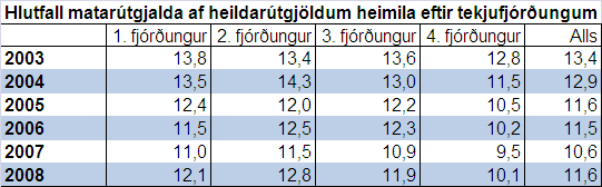 Hlutfall matarútgjalda af fór lækkandi í öllum tekjufjórðungum árin 2003-2007 en hækkaði á síðasta ári. Staðan á síðasta ári var þó sú að hlutfallið var lægra í öllum tekjuhópum árið 2008 en á árunum 2003-2004.