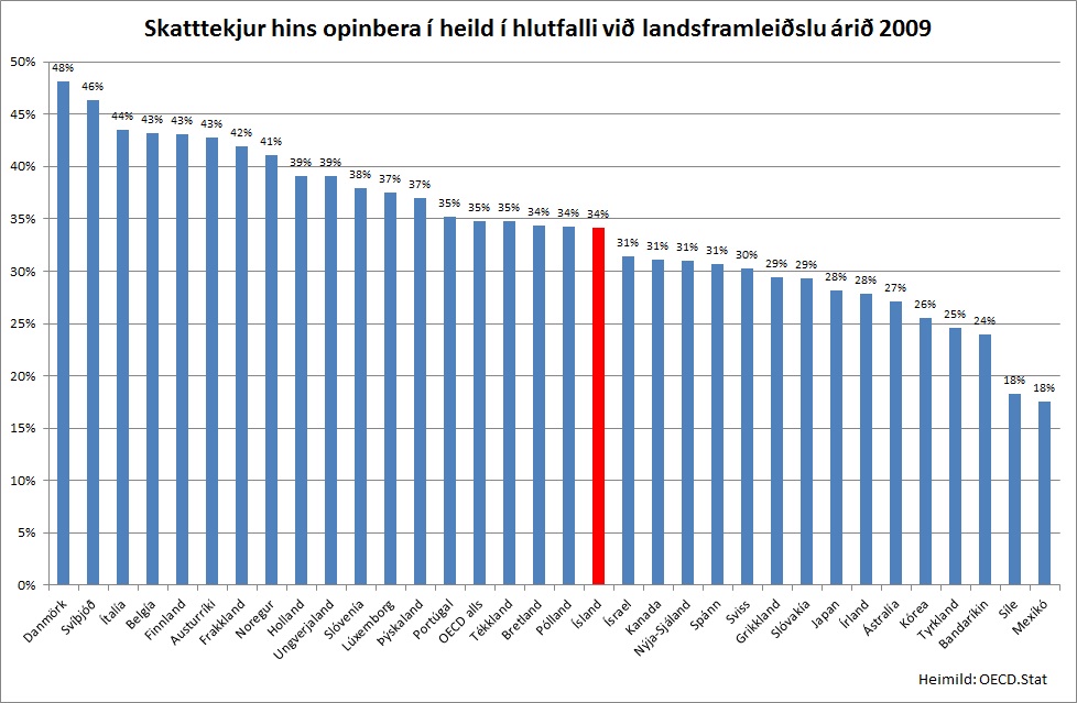 Í þeim samanburði raðast Ísland ekki hátt skv. nýjustu tölum sem fyrir liggja og eru fyrir árið 2009. Árið 2009 var hlutfall skatttekna hins opinbera á Íslandi, þ.e. ríkis, sveitarfélaga og almannatrygginga, 34,1%, eða í miðjum hópi OECD-ríkjanna, en Danmörk og Svíþjóð trónuðu á toppnum eins og þau hafa gert um langt árabil.