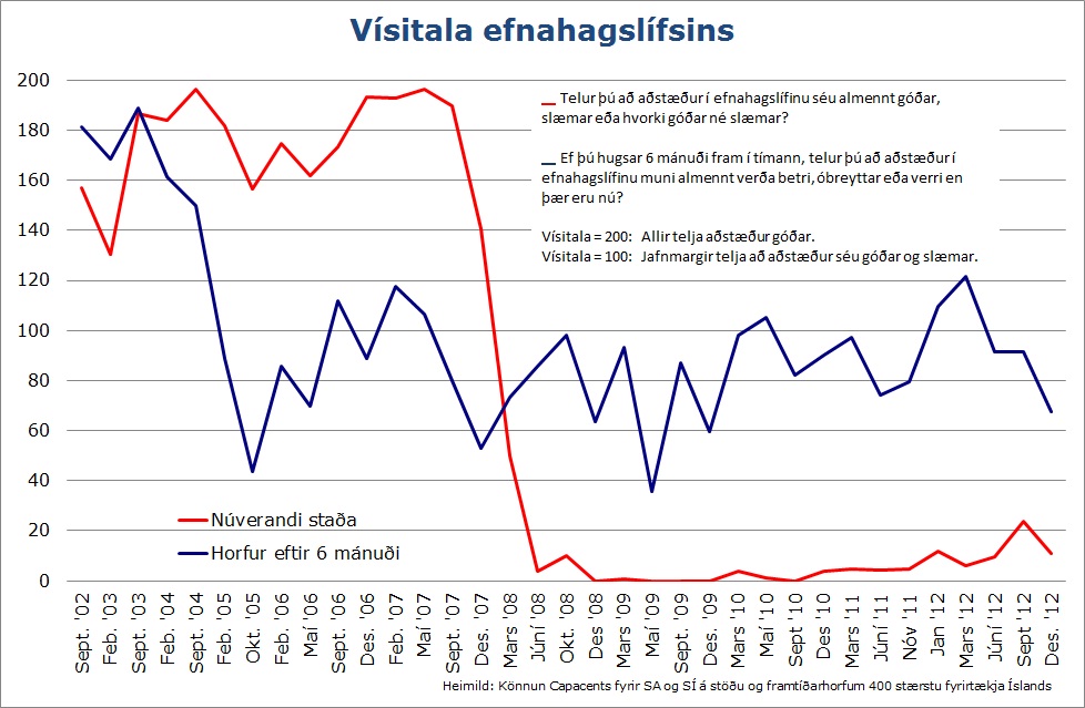 Aðstæður í atvinnulífinu hafa farið versnandi sem og horfur á þessu ári. Tveir af hverjum þremur stjórnendum telja aðstæður í atvinnulífinu vera slæmar og einungis 4% góðar, en aðrir að þær séu hvorki góðar né slæmar. Breytingin frá síðustu könnun í september 2012 er afgerandi en þá taldi innan við helmingur aðstæður slæmar. Þetta eru helstu niðurstöður ársfjórðungslegrar könnunar á stöðu og framtíðarhorfum stærstu fyrirtækja, sem gerð var um í desember 2012. Allir stjórnendur í byggingariðnaði telja aðstæður slæmar og tæp 90% stjórnenda í sjávarútvegi. Nægt framboð er af starfsfólki og þeim fyrirtækjum fer fækkandi sem skortir fólk. Í heild er búist við nokkurri fækkun starfsmanna á næstu sex mánuðum. Verðbólguvæntingar fara minnkandi en eru þó háar þar sem búist er við 4,0% verðbólgu á næstu 12 mánuðum.