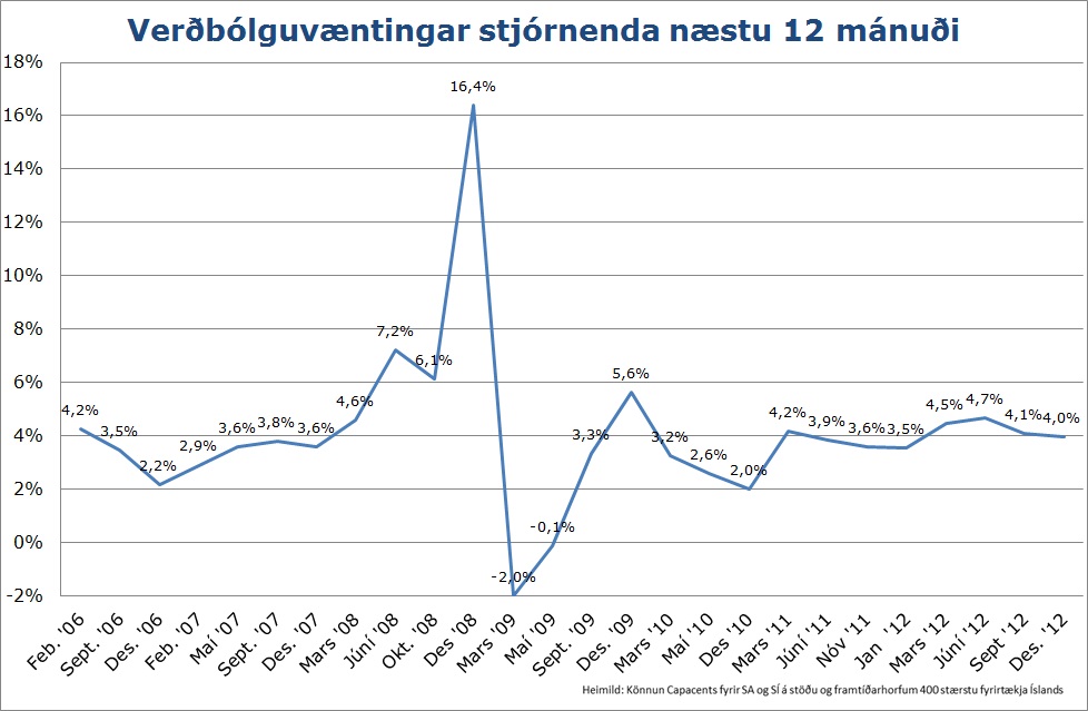 Að meðaltali búast stjórnendur við því að verðbólgan eftir eitt ár, þ.e. hækkun vísitölu neysluverðs á næstu 12 mánuðum, verði 4,0% samanborið við 4,1% í september og 4,7% í júní á síðasta ári. Verðbólguvæntingar hafa þannig farið minnkandi á undanförnum mánuðum þrátt fyrir að gengi krónunnar hafi sigið á síðustu mánuðum ársins 2012. Miðgildi verðbólguvæntinga eftir eitt ár var 4,5%.