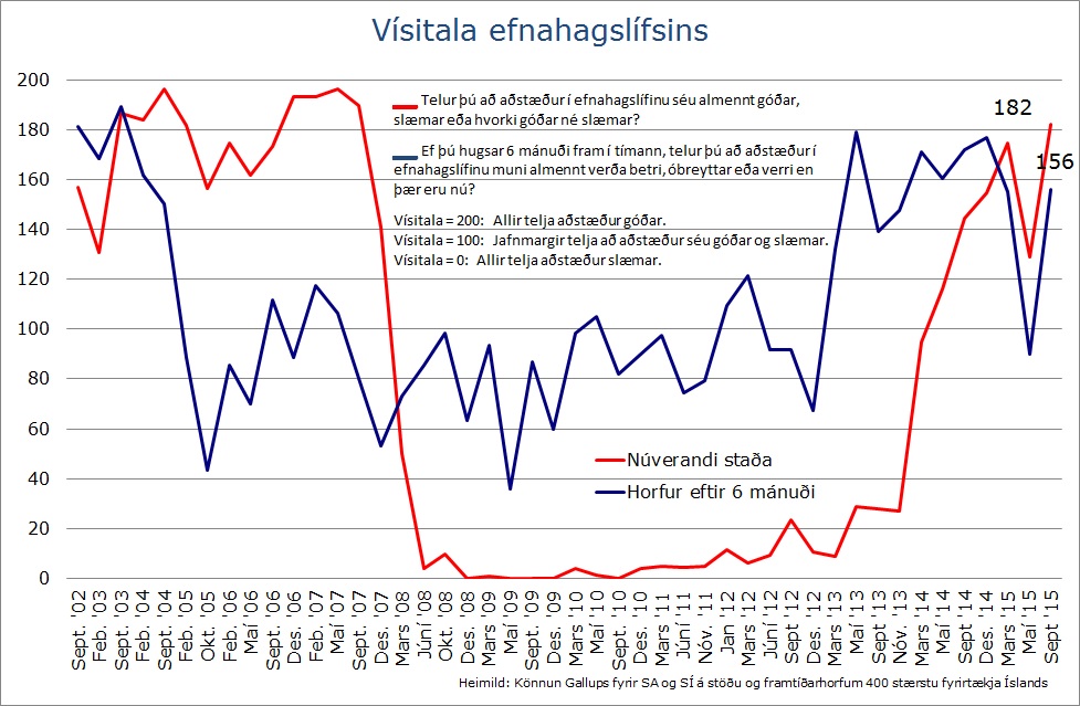 Vísitala efnahagslífsins, sem endurspeglar muninn á fjölda stjórnenda sem meta aðstæður góðar og slæmar, er nú svipuð og um áramótin 2003 og 2004 þegar síðasta efnahagsuppsveifla fyrir hrun var að hefjast. Meirihluti stjórnenda, 53%, telur aðstæður í atvinnulífinu góðar, en einungis 8% að þær séu slæmar. Í öllum atvinnugreinum telja mun fleiri stjórnendur aðstæður vera góðar en slæmar og er matið jákvæðast í fjármálastarfsemi.