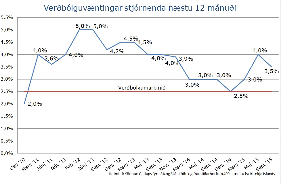Miðgildi væntinga stjórnenda um verðbólgu næstu 12 mánuði er 3,5% sem er lækkun um 0,5% frá síðustu könnun. Væntingar stjórnenda um verðbólgu eftir tvö ár er einnig 3,5% sem er 0,4% hækkun frá síðustu könnun.