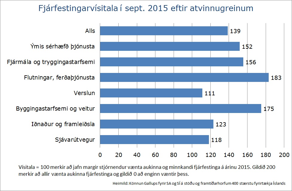 Fjárfestingar fyrirtækjanna munu aukast mikið á þessu ári samkvæmt könnuninni. 33% stjórnenda sjá fram á auknar fjárfestingar en 11% búast við að þær minnki miðað við árið 2014. Þessar vísbendingar um fjárfestingar eru sterkari en í síðustu könnunum. Langmest aukning fjárfestinga er áætluð í byggingarstarfsemi og flutningum og ferðaþjónustu en aukningin er mikil í öllum atvinnugreinum nema verslun.