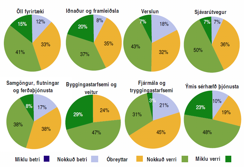 Það vekur að vísu athygli að fjórðungur fyrirtækja í fjármála- og tryggingastarfsemi telja sig skorta starfsfólk og um fimmtungar býst við að ráða fólk á næstu sex mánuðum. Hér verður þó að hafa í huga að fjármálafyrirtæki eru almennt undir miklu álagi um þessar mundir, starfsemi þeirra hefur breyst mikið á skömmum tíma og flest hafa þurft að segja upp starfsfólki. Er því skiljanlegt að sum fyrirtækjanna telji sig skorta starfsfólk. Þá hafa a.m.k. sum smærri og miðlungsstórra fyrirtækja í greininni aukið starfsemi á vissum sviðum og skýrir það væntanlega að mestu áform um fjölgun. Hafa þarf í huga að hlutfallstölur í könnuninni byggjast á fjölda fyrirtækja.