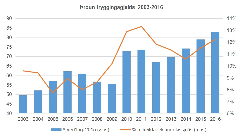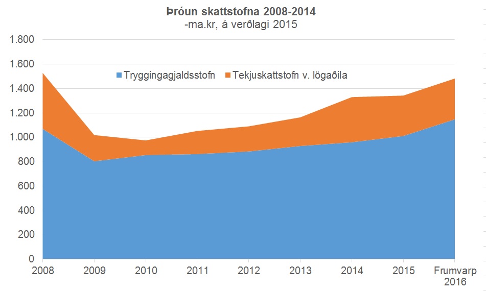 Nú horfir öðru vísi við. Tryggingagjaldsstofn hefur hækkað jafnt og þétt að raungildi allar götur frá árinu 2010 og er nú 50% hærri en 2009. Fjárlagafrumvarp 2016 gerir ráð fyrir að tekjur ríkissjóðs af tryggingagjöldum verði 86 milljarðar króna sem er raunaukning um 28 milljarða króna frá árinu 2008. Tekjur ríkissjóðs af tryggingagjöldum verða 12,3% af heildartekjum ríkissjóðs, samanborið við 8,8% árið 2008. Tryggingagjaldsstofninn mun stækka mikið að raungildi á árunum 2016 og 2017 vegna mikillar aukningar kaupmáttar launa og fjölgunar starfa. Mikil stækkun stofnsins umfram aðra tekjustofna ríkisins og ásamt horfum á því að hlutdeild hans í tekjum ríkissjóðs aukist mikið á árunum 2015-2017 gefa fullt tilefni til lækkunar tryggingagjaldsins.