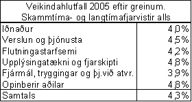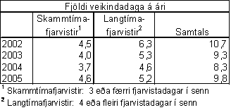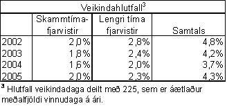 Meðalfjöldi fjarvistadaga, bæði vegna eigin veikinda og slysa og fjölskyldumeðlima á hvern starfsmann var 9,8 árið 2005 og fjölgaði um 1,5 dag frá árinu áður. Mestar urðu fjarvistirnar árið 2002 en þeim fækkaði síðan bæði árið 2003 og 2004. Fjarvistum er skipt í skammtíma- og langtímafjarvistir eftir lengd og teljast þrír eða færri dagar í senn til skammtímafjarvista og fjórir eða fleiri í senn til langtímafjarvista. Mismunandi þróun kemur fram eftir lengd fjarvista þar sem hlutdeild skammtímafjarvista í heildarfjarvistum hefur vaxið ár frá ári. Aukningu fjarvista á árinu 2005 má að tveimur þriðju hlutum rekja til aukningar skammtímafjarvista.