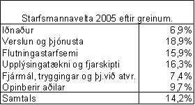 Náið samband kemur fram á milli starfsmannaveltu og þenslu á vinnumarkaði. Starfsmannavelta var nokkuð mikil á árinu 2005, eða 14,2%, sem samsvarar því að sjöundi hver starfsmaður fyrirtækjanna hafi skipt um starf. Starfsmannaveltan var helmingi meiri en fyrir tveimur til þremur árum þegar tíundi hver starfsmaður skipti um starf. Starfsmannaveltan var mest í verslun og þjónustu en minnst í iðnaði.