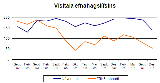 Niðurstöður úr könnuninni má draga saman í vísitölu efnahagslífsins*, sem sýnir mat fyrirtækja á núverandi efnahagsástandi og horfum eftir sex mánuði. Til samanburðar eru á eftirfarandi mynd sýndar niðurstöður um sama efni úr fyrri könnunum. Lægsta gildi vísitölunnar er 0, þegar allir telja aðstæður verri en hæst 200, þegar allir telja þær betri. Jafnvægi er við gildið 100, þegar jafn margir telja aðstæður betri og þeir sem telja þær verri. Af þessum upplýsingum má draga þá ályktun að þær hagstæðu aðstæður sem ríkt hafa í efnahagslífinu undanfarin 5 ár eða svo virðast nú á hverfanda hveli. Með hliðsjón af óróa og niðursveiflu á fjármálamörkuðum undanfarna daga er ljóst að aðstæður í atvinnulífinu hafa versnað frá því könnun þessi var gerð undir lok síðasta árs.