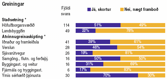 Könnunin gefur til kynna að spenna á vinnumarkaði fari heldur minnkandi. Um 58% fyrirtækja sem svöruðu könnuninni telja sig nú hafa nægjanlegt framboð starfsfólks en skortur er á starfsfólki hjá um 42% fyrirtækja. Um helmingur fyrirtækja á höfuðborgarsvæðinu telur sig skorta starfsfólk, en utan þess telja aðeins um 22% fyrirtækja að þau skorti starfsfólk. Eins og eftirfarandi mynd sýnir er það mismunandi eftir atvinnugreinum hve mikill skortur er á starfsfólki, en mestur er hann í ýmissi sérhæfðri þjónustu. Í fjármála- og tryggingastarfsemi er hins vegar að mestu nægt framboð vinnuafls.
