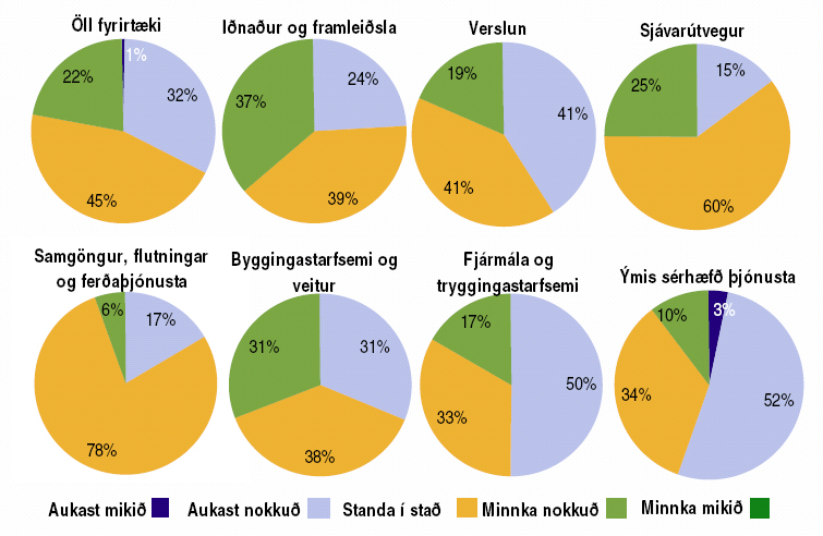 Væntingar um samdrátt í innlendri eftirspurn næstu sex mánuði koma einkum fram í iðnaði og byggingastarfsemi, en betri horfur koma fram í þjónustu, verslun, fjármálastarfsemi, samgöngum og ferðaþjónustu.